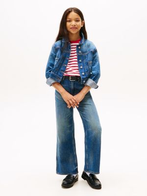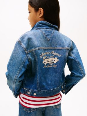 This denim trucker jacket features all-over fading for a vintage vibe and bold logo embroidery on the back.