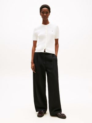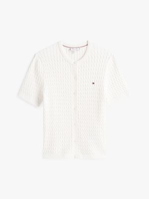 This short-sleeved cardigan with an intricate, fine gauge cable knit is a fresh take on a classic design, offering day-to-evening style.