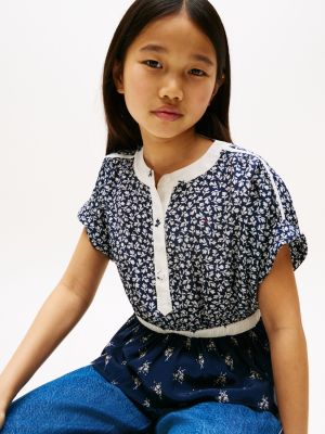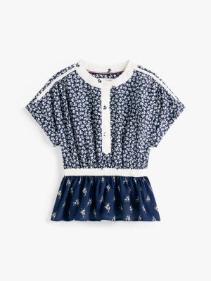 Get into a summer mood with this cap-sleeved blouse, featuring a mix of floral prints and a gathered peplum waist.
