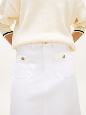 This white-washed midi pencil skirt is a sophisticated addition to your denim collection, featuring flag-embossed gold-tone buttons for a luxurious touch.