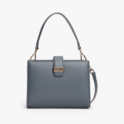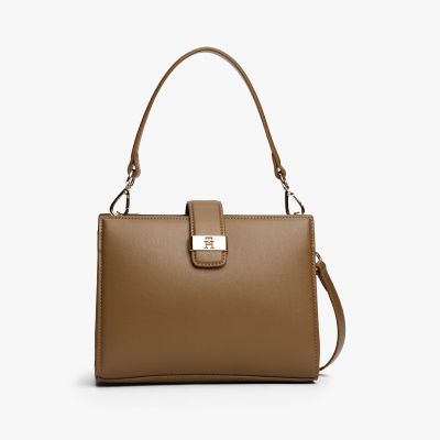 This compact satchel seals with a TH monogram plaque closure, complementing the gold-tone debossed logo charm hanging from the side.