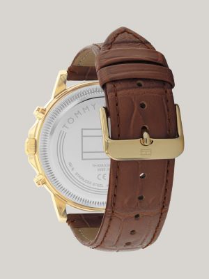 A multi-dimensional silver-tone dial and ionic gold-plated case help to give this leather strap watch an elevated look for formal occasions.