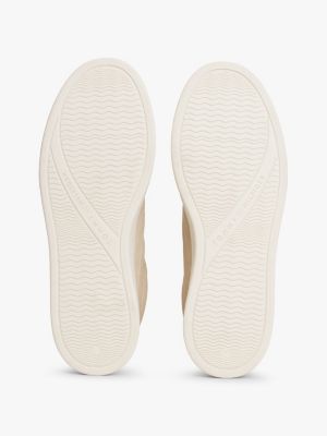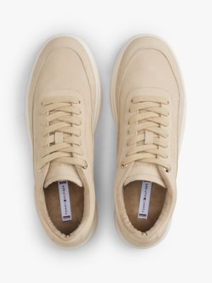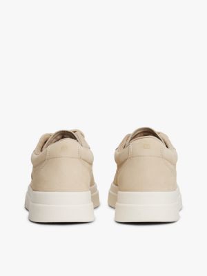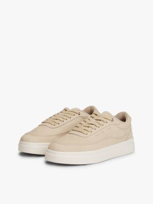 These luxe nubuck leather court trainers feature a classic low-top silhouette with a glinting metallic logo debossed on the side.