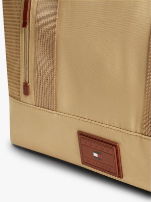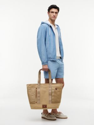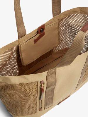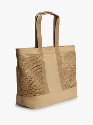 This canvas beach tote bag showcases mesh panels with a sheer finish and an exterior zip pocket for securing smaller essentials.