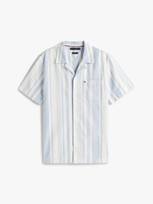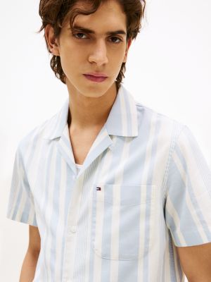 Refresh your summery looks with this pure cotton shirt, featuring a retro-inspired camp collar and a vertical stripe design.