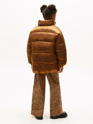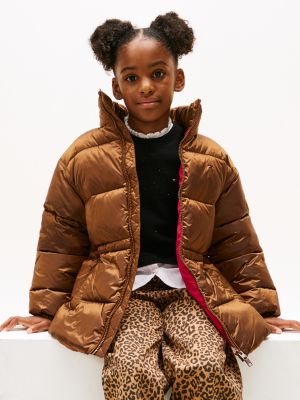 This shiny puffer jacket is designed with a concealed adjustable toggle cord waist, meaning it can be styled loose or cinched.