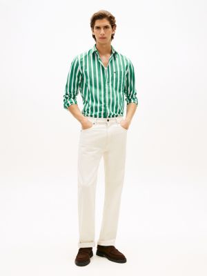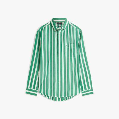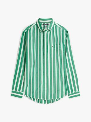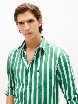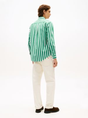 This pure peached cotton poplin button-down shirt, sporting a bold all-over stripe, is perfect for all-day wear with its four-way stretch technology.